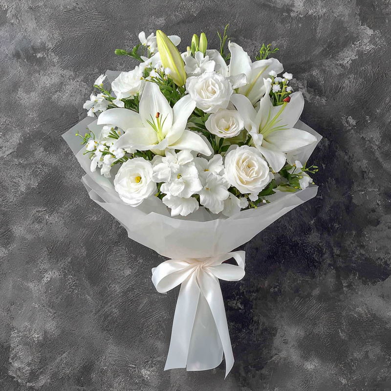 This bouquet is a whisper between moonlight and morning dew. Lilies unfold their pure white petals like dreams of falling snow; white eustomas bloom softly, like poems written in frost. Tiny white blossoms scatter like stardust, weaving a quiet painting within the pristine wrapping. A white ribbon is tied into a gentle bow, as if softly singing,"Let the night’s silvery glow and the morning’s pure beauty gather in this bouquet."At first glance, you’re drawn into a whirl of ivory serenity, where even the breeze carries a faint sweetness. This is a verse of tenderness and purity, where each flower gently speaks: "Let petals become letters that write the quiet joys of life."